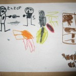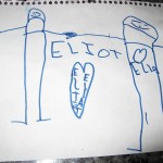So, here are a couple drawings to illustrate the drama. On the left, Eliot draws a pic of he and Ella in sweet embrace; on the right is a drawing Ella made for Eliot – upper left is Eliot shooting Sidney with a laser, causing him to cry. insane…