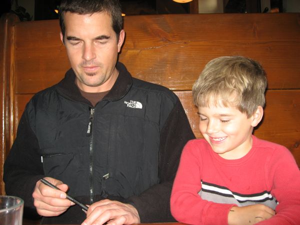 - Some scenes from the airport and the restaurants we visited, passing the time by drawing or playing airplane with Eliot.