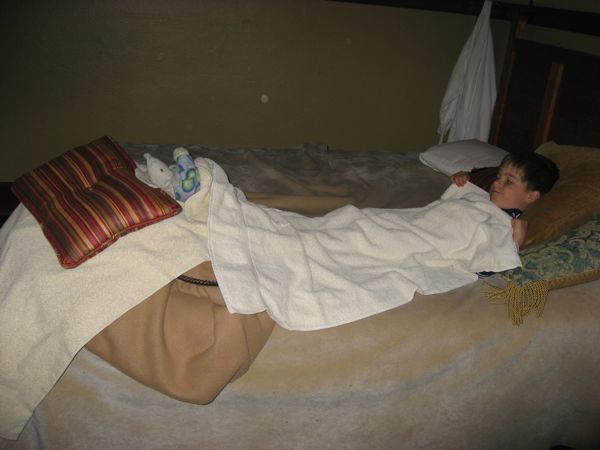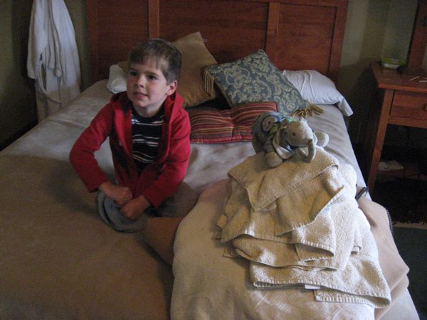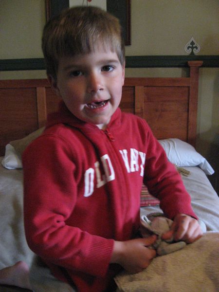 - Quite a few pictures of our room, which Eliot thoroughly enjoyed. These are particularly indicative of his overwhelming love for his elephant – “Iyo” – these days. He just can’t get enough of this animal that is so thread bare and emaciated that my mom had to craft a fleece cover to keep the pachyderm intact. It’s a beautiful thing, though – a boy’s fondness of his cherished lovey!