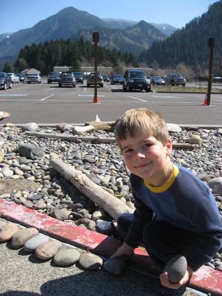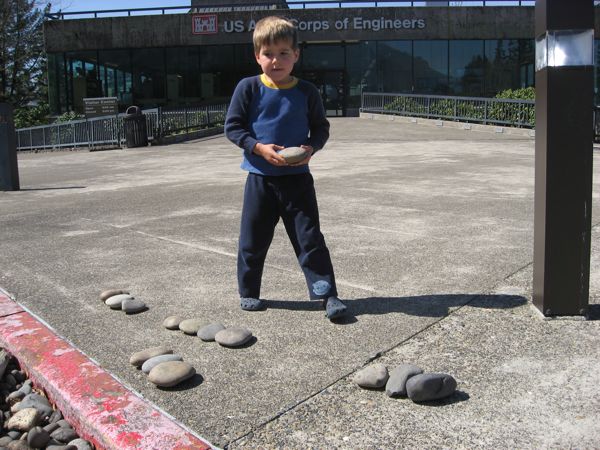 - And then there was the stop at the dam and locks – Eliot found this cool area landscaped with river rock and driftwood that he was fascinated by. He immediately began pulling out special rocks onto the sidewalk. Then he stood tall, looked at his assemblage, and announced, “Okay, now I have to ORGANIZE them.” Again, here are one of those times that you see yourself inĀ your child and it is wonderful at the same time that it is frightening. He did, though – sorted the whole lot into shiny, flat, and crooked piles. Seems logical to me.