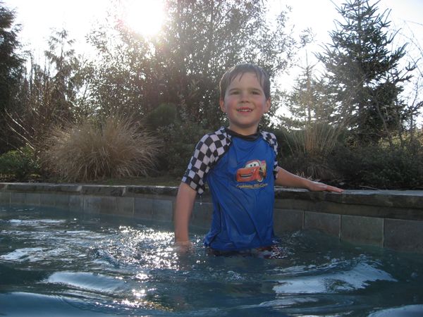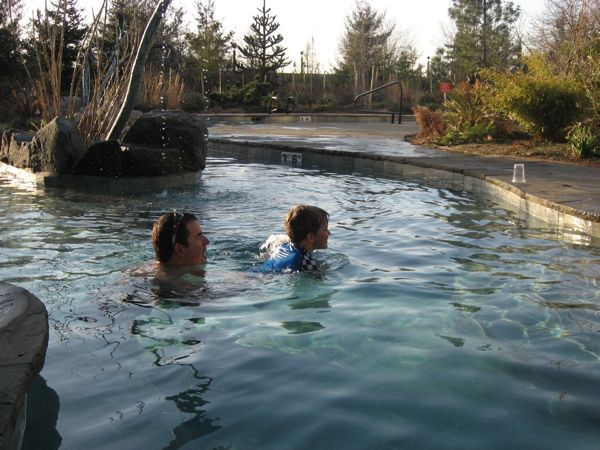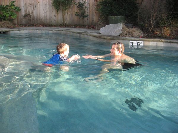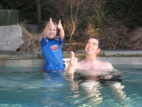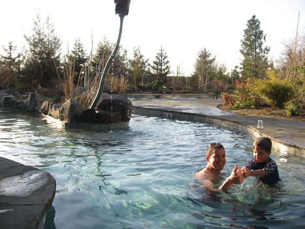- But the highlight of the trip was the soaking pool. AAAAHHH, the soaking pool! The place we stayed is owned by a company that buys historic properties and turns them into cool hotel/resort facilities. A signature part of their ventures is to include a cool soaking pool – essentially a shallow pool that is heated to about 100F, lovely to soak but not too warm that you are itching to get out after a bit. This one had the added features of showers that rained down after pulling on various chains – a huge hit for Eliot. In any event, he loved this one (as did we), and was keen on “swimming” back and forth to Scott and I, as long as we weren’t too far away. By the way, he has real swimming lessons beginning this weekend, so this was a great preliminary adventure to get him excited about swimming for real.