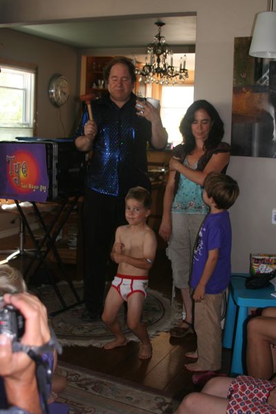 Eli had the pleasure of not one, not two, but three birthday parties (and two more yet to come – at his preschool, and with the yogamom kids). First was a family party with Grandma Suzi (her birthday is the day before), the other Smith family, Uncle Adam, and his friend Ike and crew. The highlight was definitely the big can of whiffle balls from Grandma Charlee! Second came his actual birthday, opening presents from Grandpa Don and others. Then the party with his friends where we enjoyed a great magic show and ice cream cake. And, for a second year in a row, superheros (and underpants) made for a perfect theme. Fun, fun, fun!